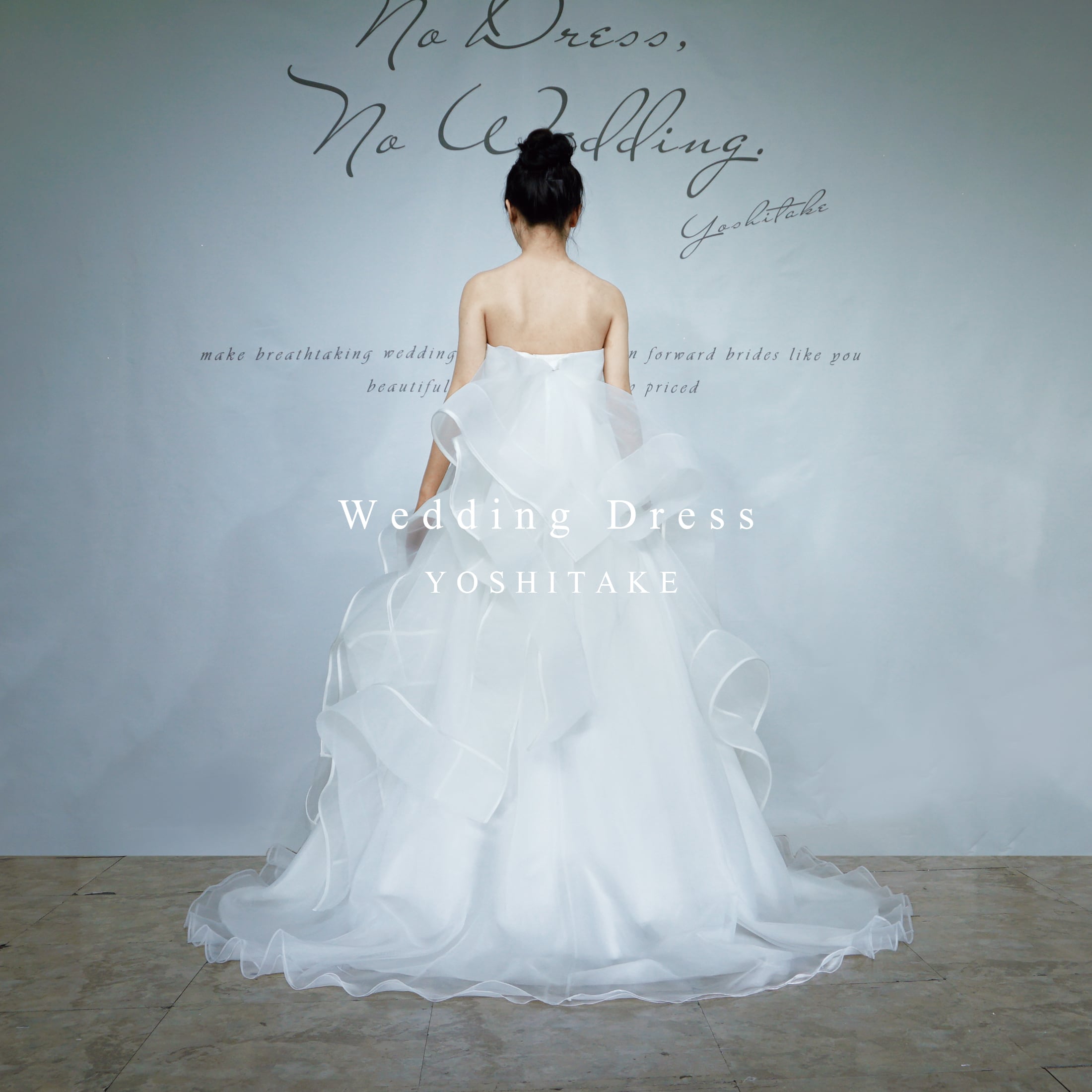 まるでリボンを纏ったような、アンシンメトリーに広がるスカートが遊び心のある一着。歩くたびにひらひらと表情が変わって、とっても華やか。自分らしくオシャレにキメたい花嫁さんにぴったりの一着です。