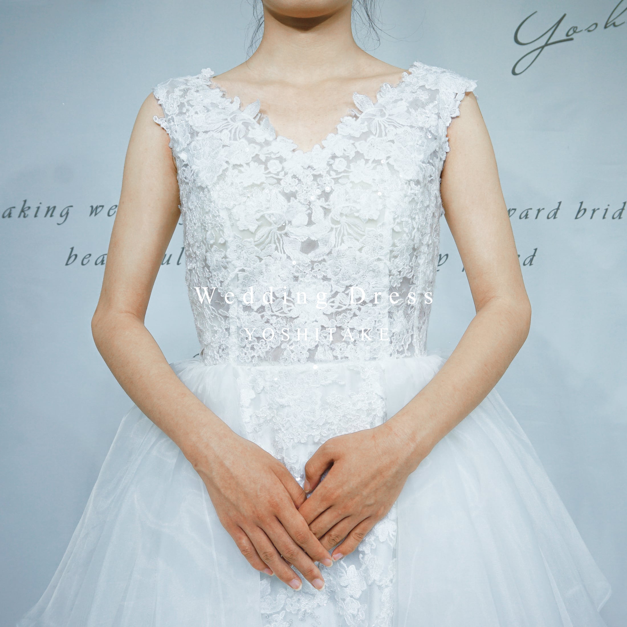 刺繍レースのビスチェに、ふわっと広がるオーガンジーのティアードスカート。控え目なAラインだけど、ロングトレーンで華やかさも忘れない。軽やかで動きやすい丈感で、ガーデンパーティにもおすすめの一着。