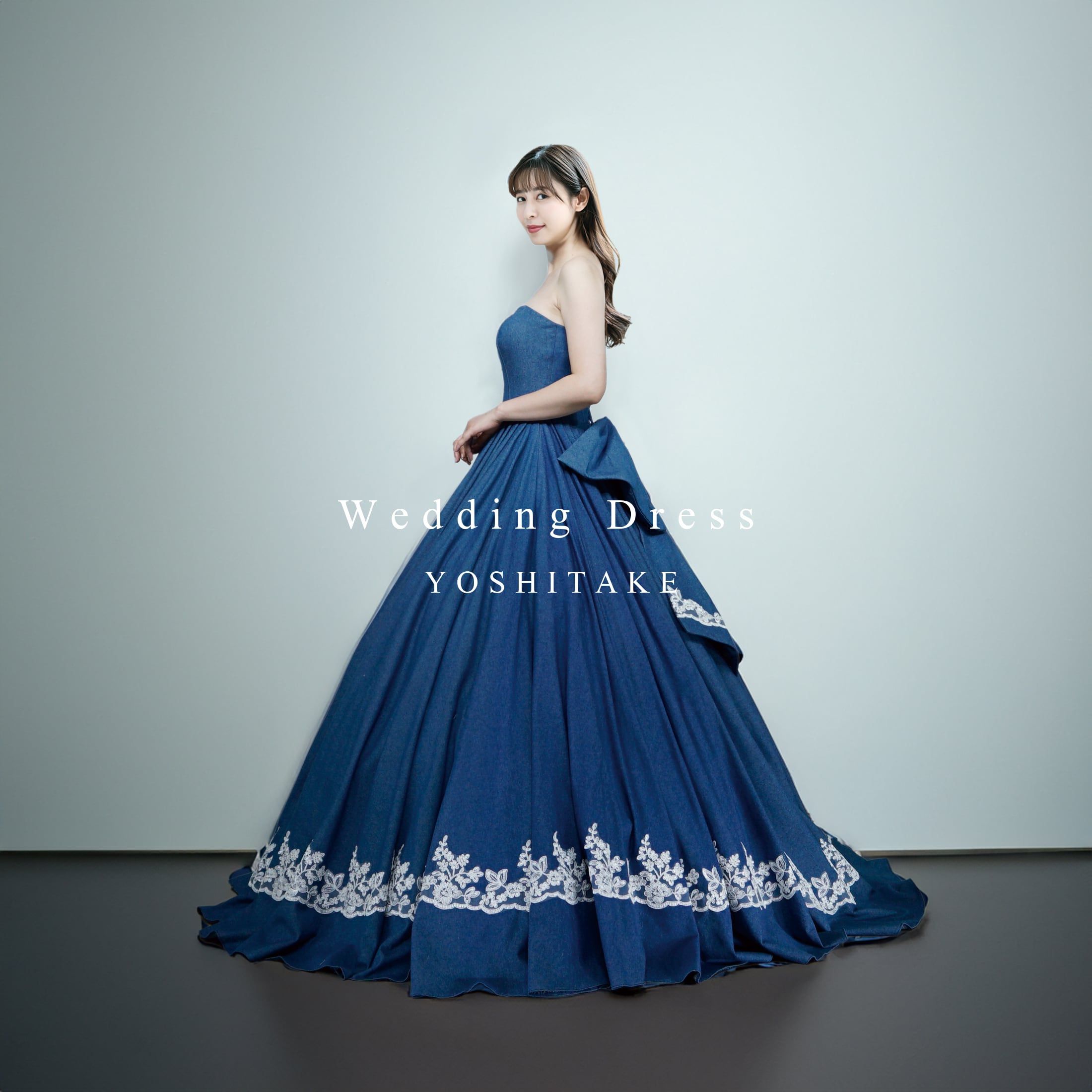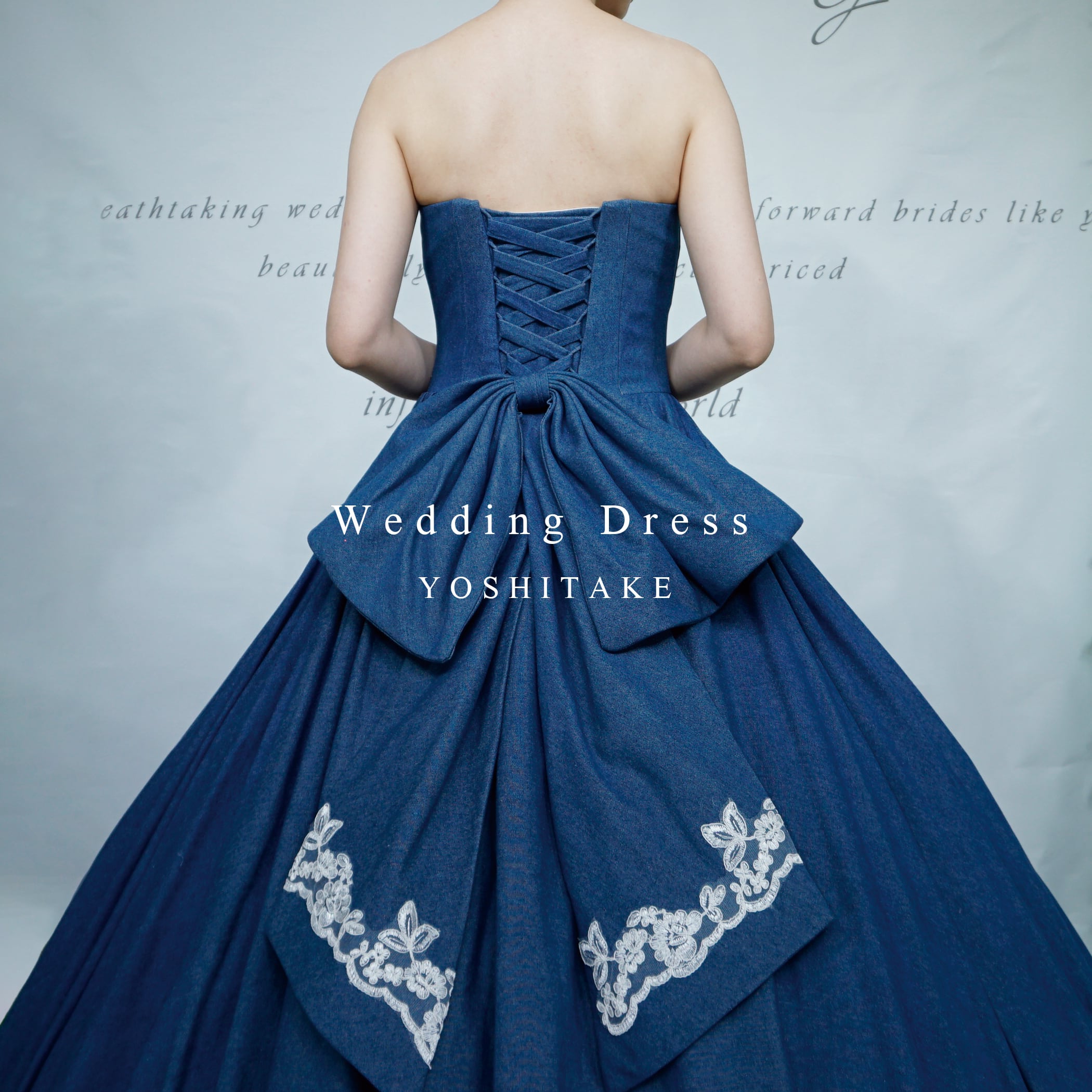 爽やかなデニム生地を使用したドレスで、ナチュラルに自分らしく。白レースが映える裾のデザインは、歩くたびに軽やかさを演出してくれます。周りとちょっと差をつけたい花嫁さんにおすすめの一着です。
