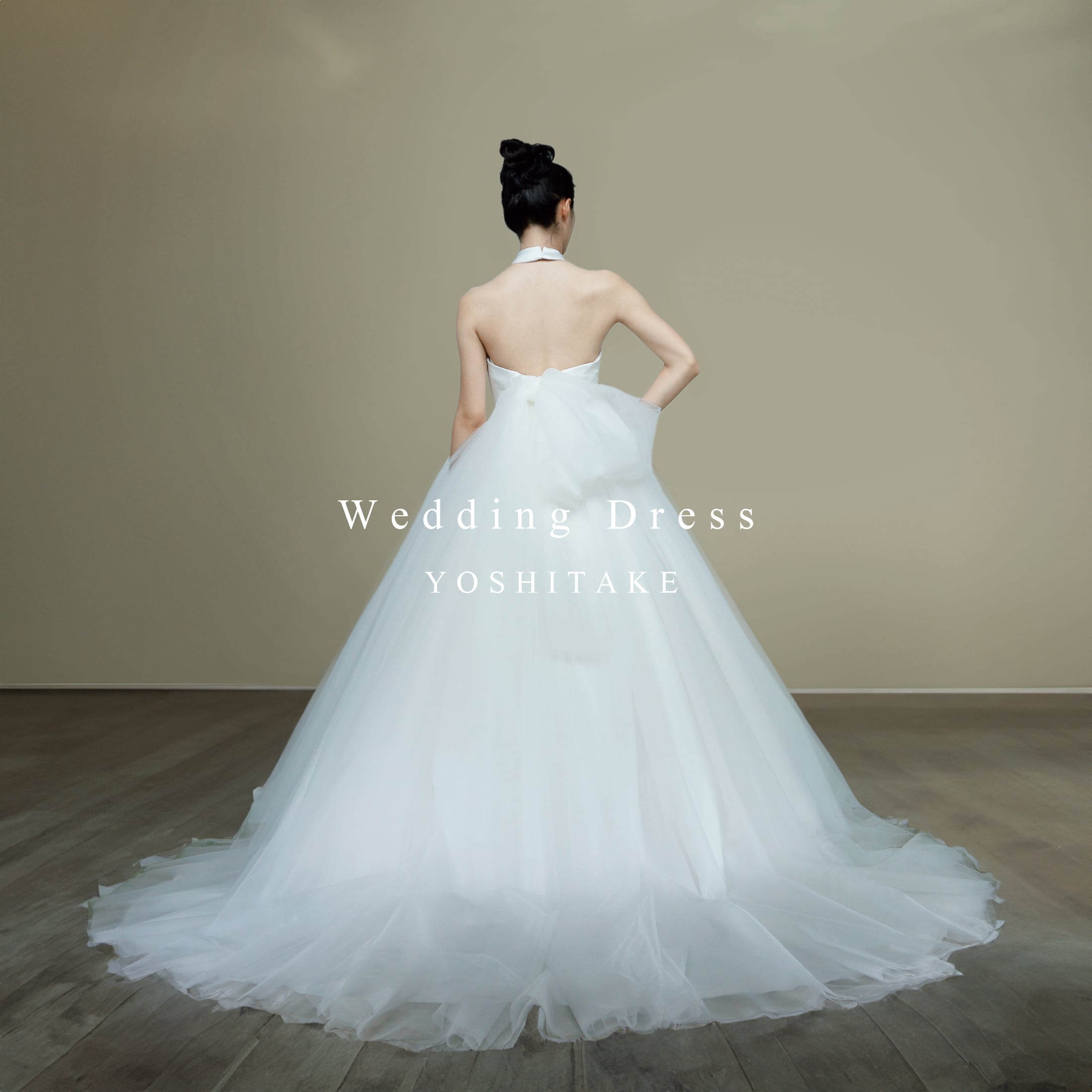 エレガントなホルターネックが凛とした雰囲気を醸し出すドレス。ふわっと広がるチュールスカートと、バックの大きなリボンで可愛さも忘れないデザイン。大人っぽさとキュートさをバランスよく楽しめる一着です。