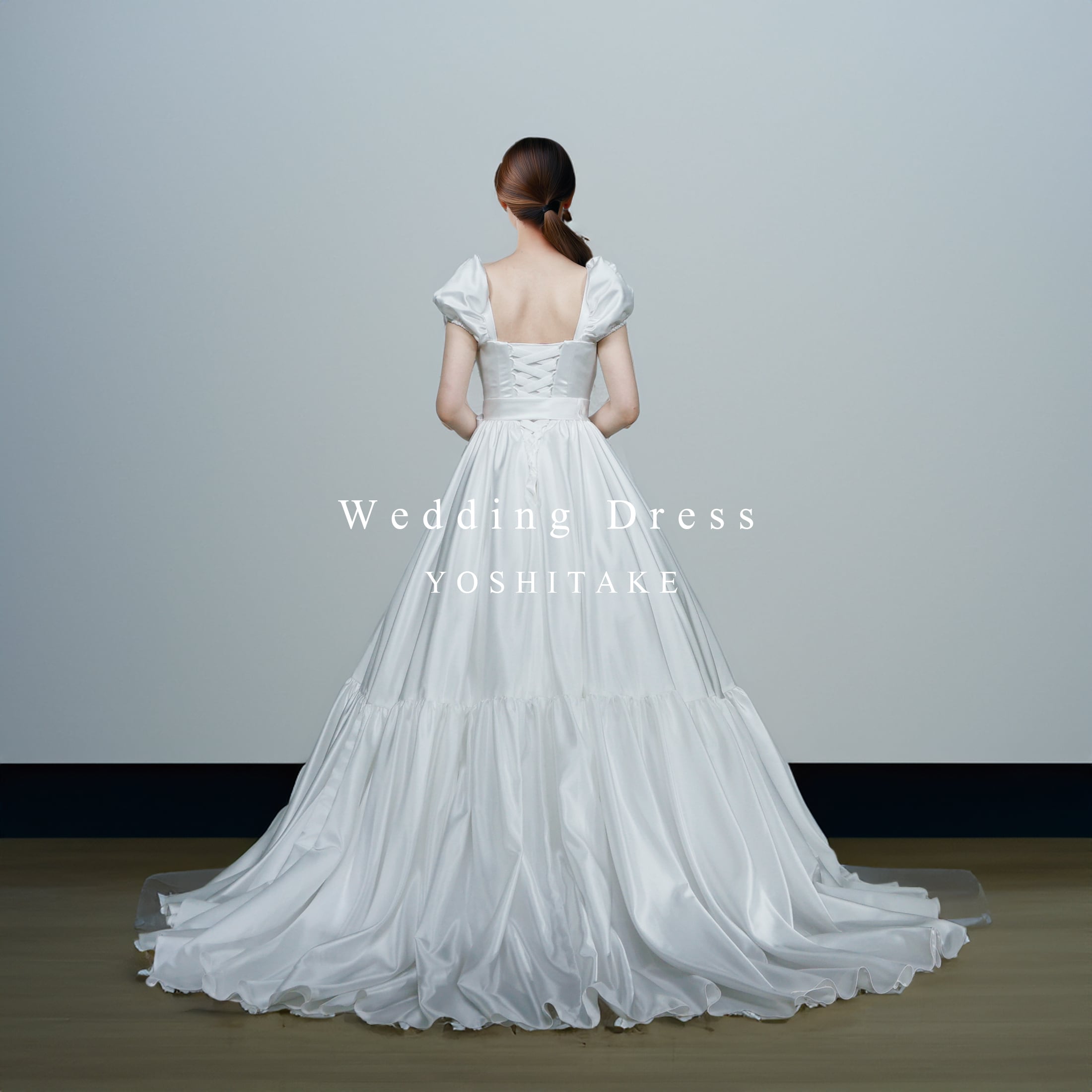 可憐さと上品さを兼ね備えたドレス。控え目なパフスリーブとウエストの細目リボンが清楚な雰囲気を演出します。動くたびに揺れるスカートが、特別な日の姿をよりドラマティックに見せてくれます。