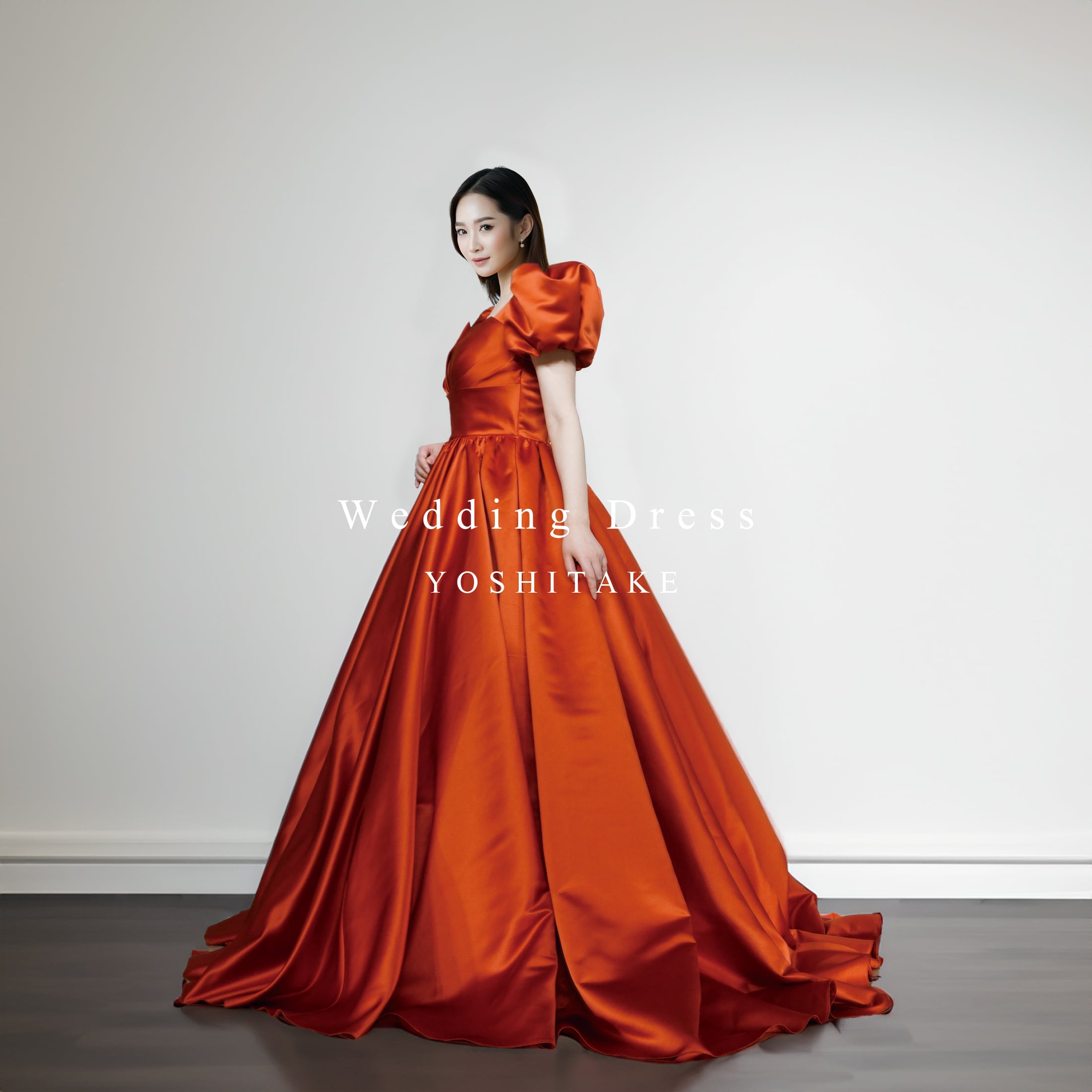クラシカルなパフスリーブが絵本のお姫様の様な一着。ツヤのあるオレンジサテンが存在感を放ち、ふわりと広がるスカートで華やかさも満点。特別な日をぐっとドラマチックにしてくれるドレスです。