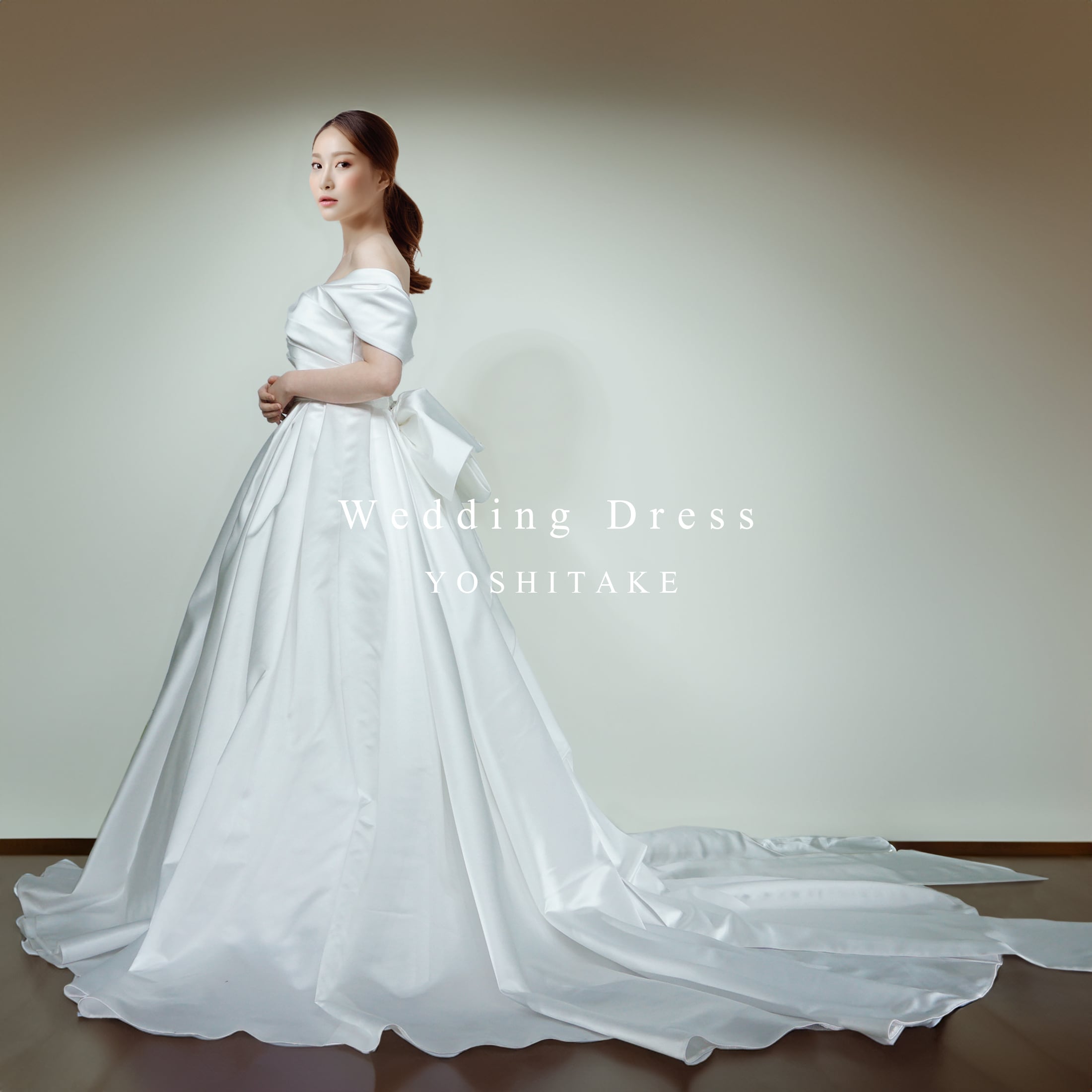 オフショルダーがデコルテを美しく見せ、ウエストのドレープがすっきりと引き締めてくれます。バックの大きなリボンと流れるトレーンで、絵になる王道クラシックドレス。特別な日にぴったりの、上品で華やかな一着。