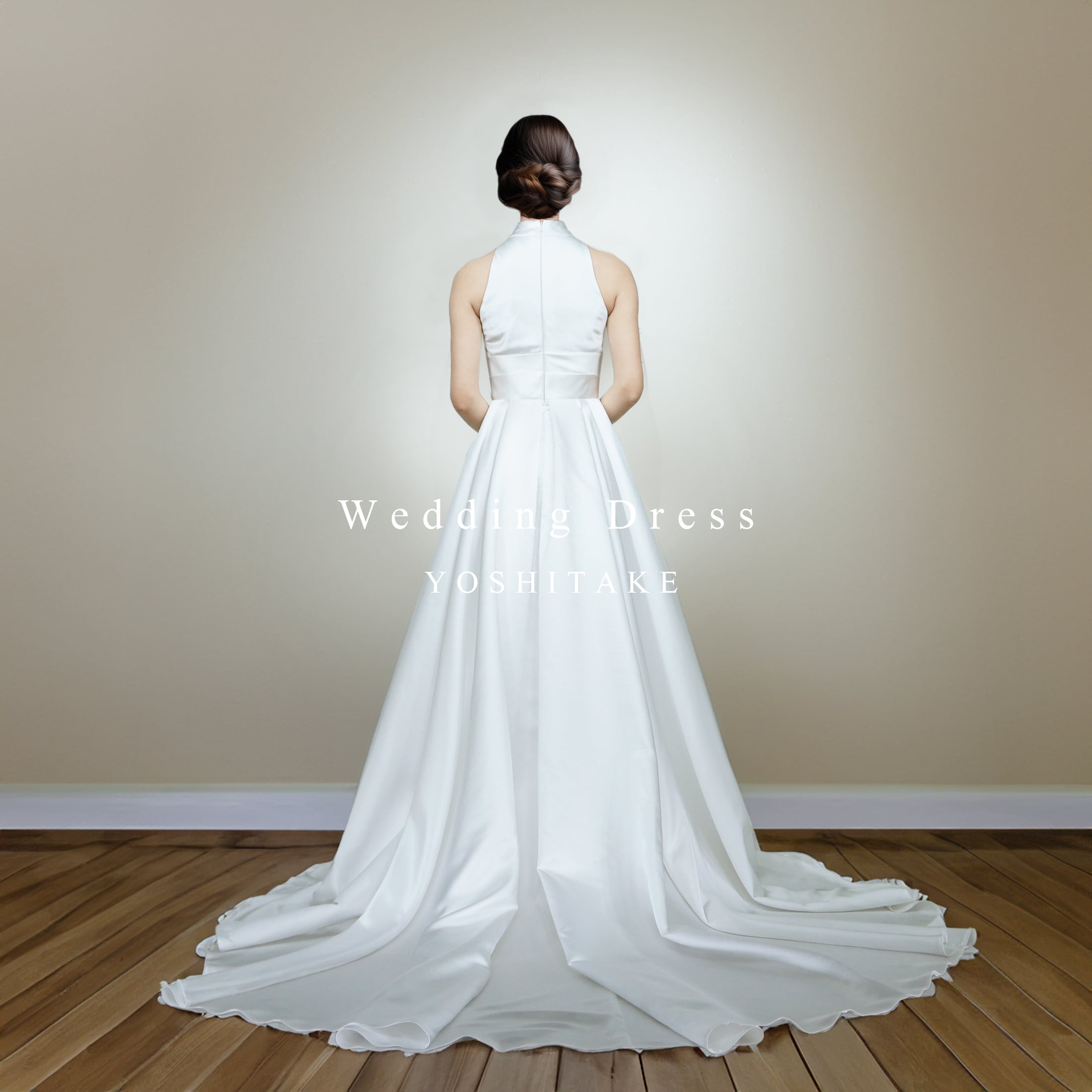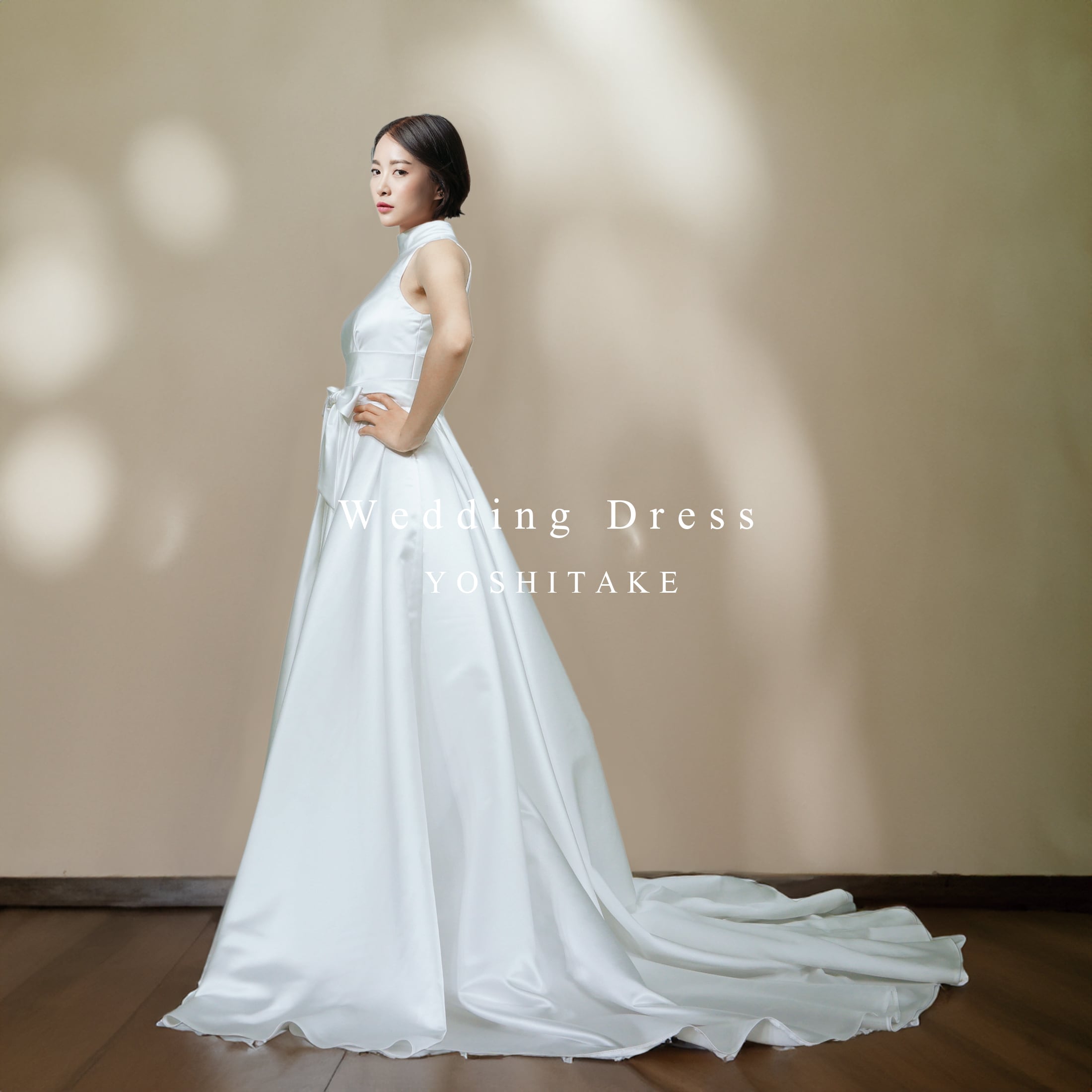 【オーダー制作】ウエディングドレス(無料パニエ) ウエディングドレス.白.サテン.ウエストリボン.Aライン.ハイネック ※制作期間3週間から6週間 Y2354