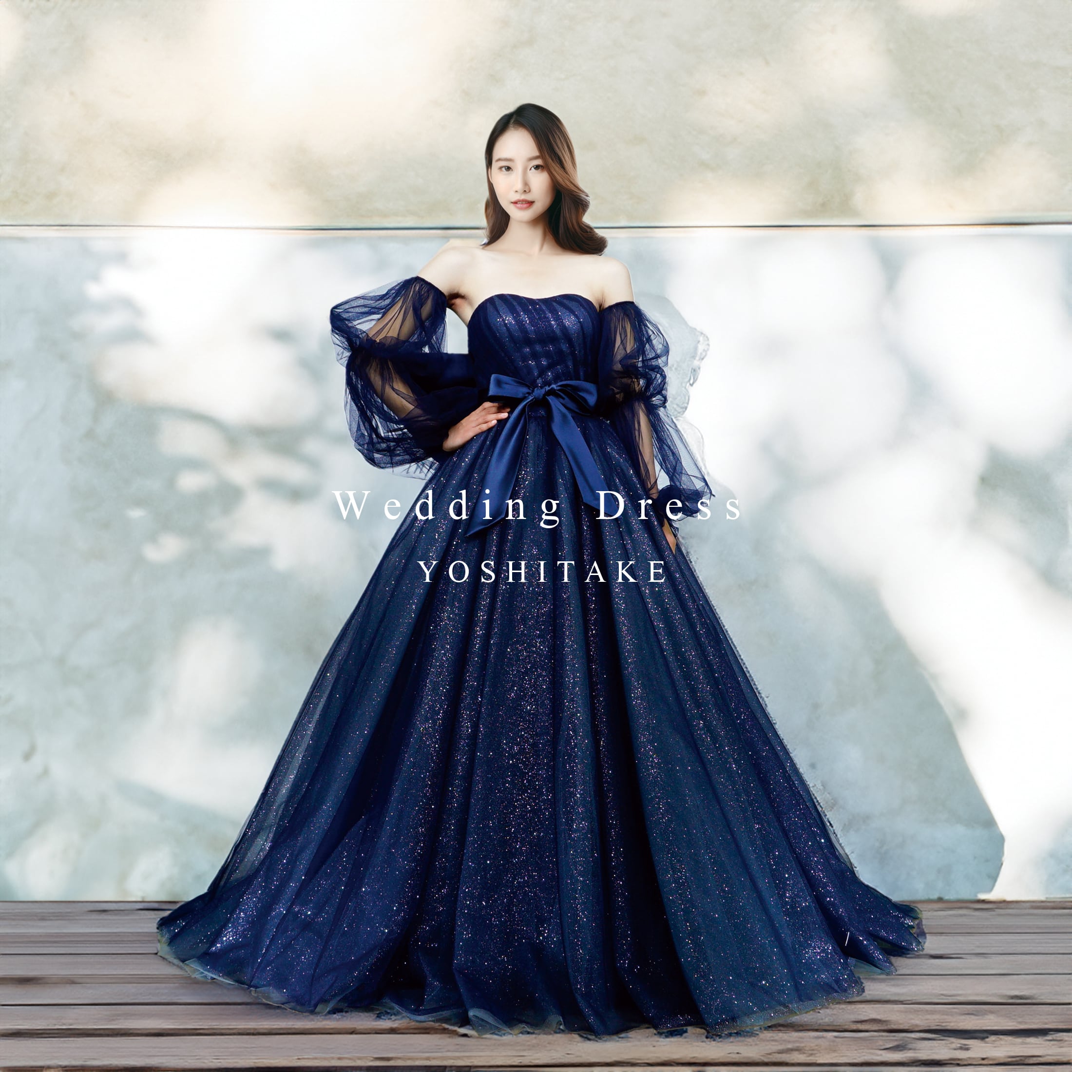 夜空にきらめく星の様に輝くネイビードレス。光が当たるたびにラメがきらりと瞬き、華やかさ満点。ふんわりチュールの袖と、大きなバックリボンが印象的なデザインで、どの角度から見ても可愛い一着です。