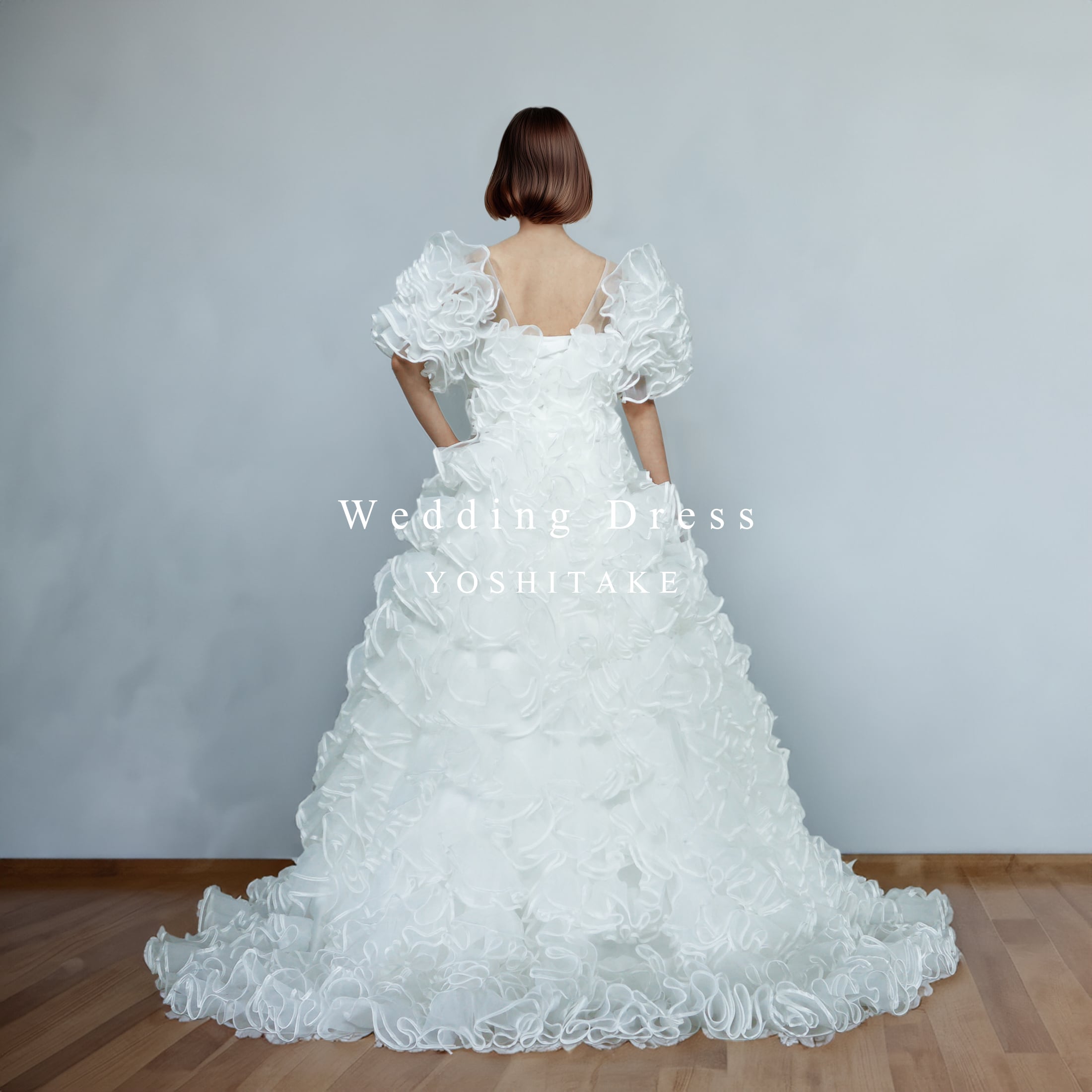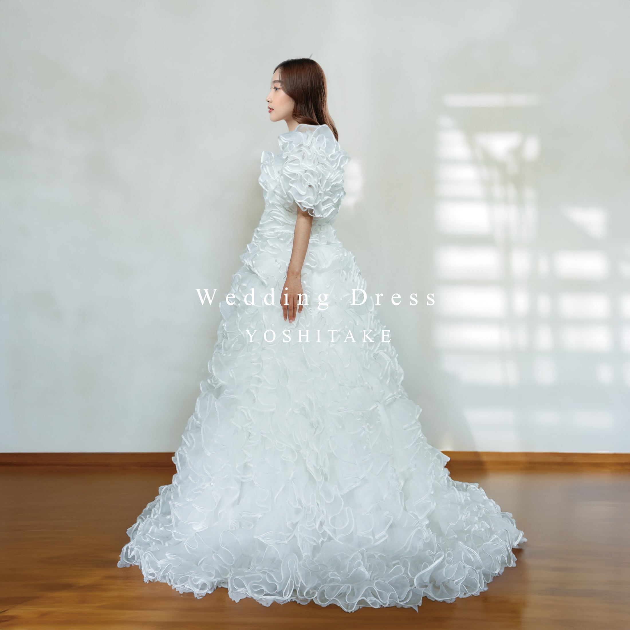 花びらをまとったような立体的なフリルが、やわらかく広がる印象的なドレス。動くたびにふんわりと表情が変わり、甘すぎない上品さと洗練された雰囲気を演出してくれます。シンプルな中にも個性が光る一着です。