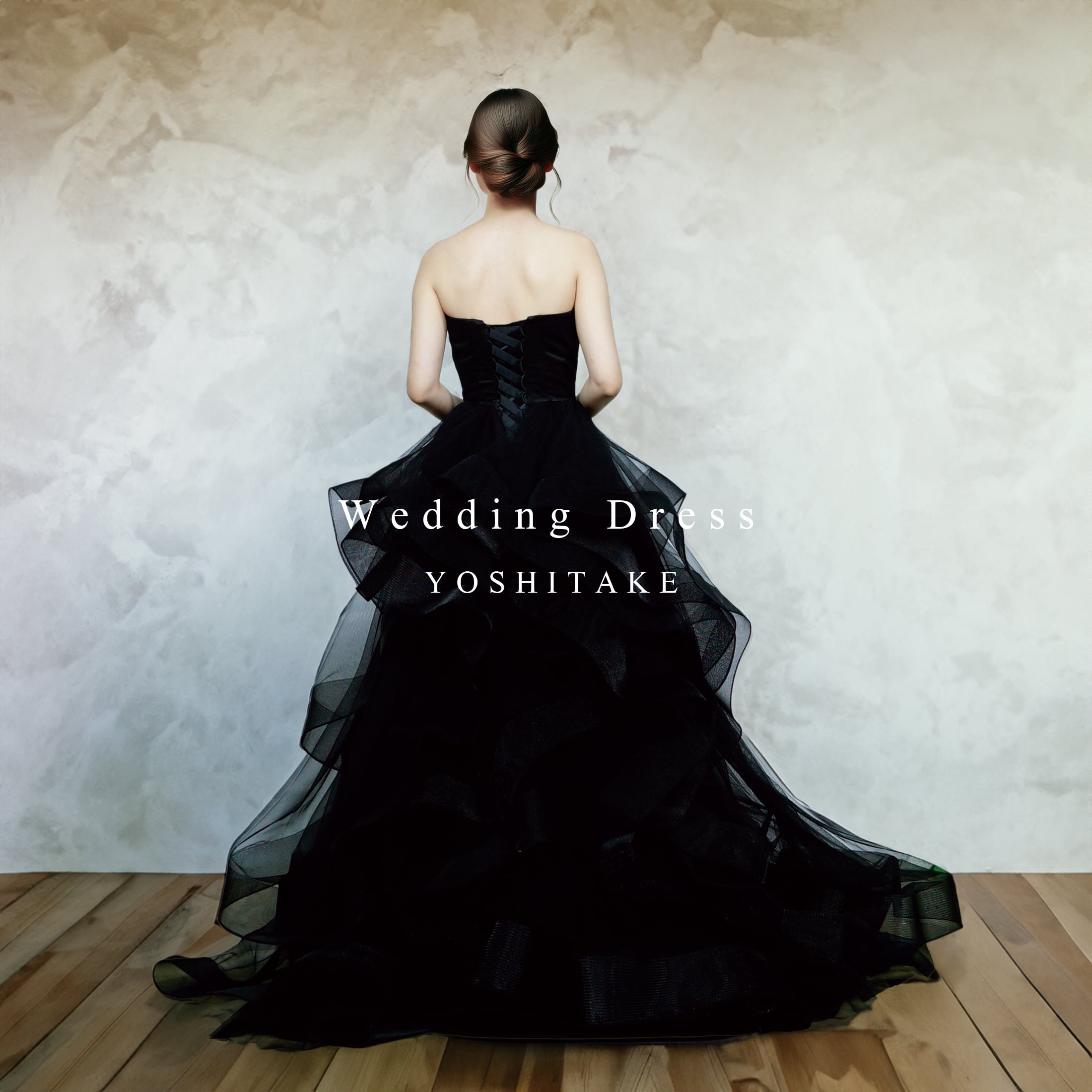 漆黒のブラックカラーで王道のウェディングスタイルにちょっと差をつけて。胸元のスリットにはチュールを重ね、抜け感のある大人っぽさを演出します。ふんわり重なるフリルスカートは、どの角度から見ても華やか。