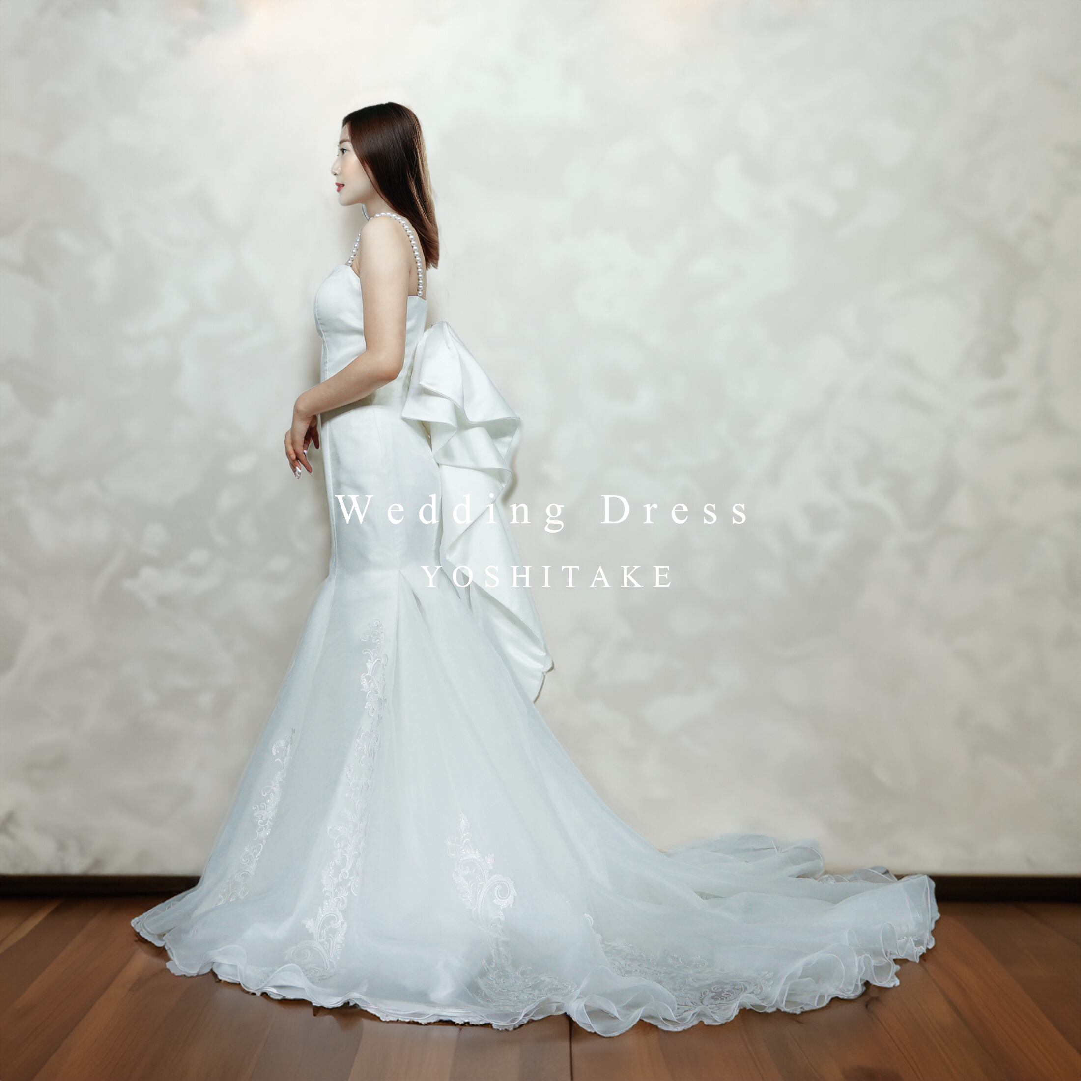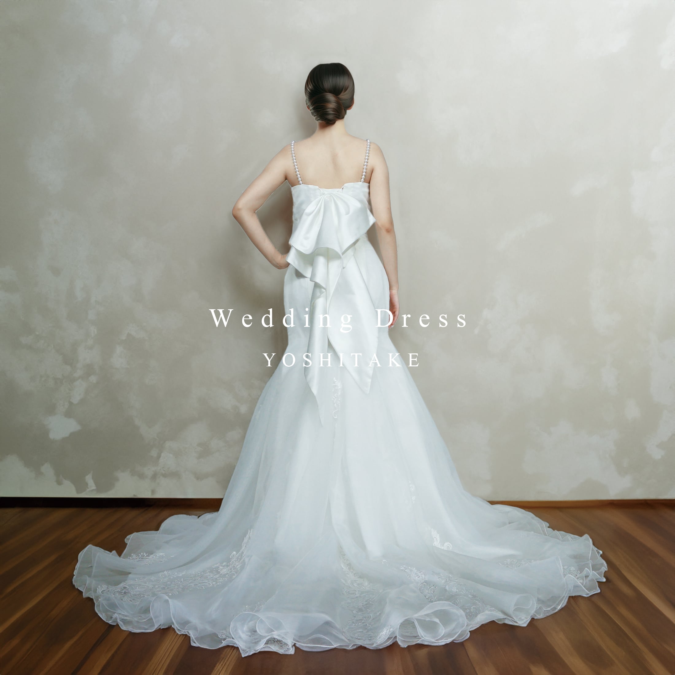すっきりシルエットがきれいなマーメイドドレス。デコルテを彩るハートカットと、さりげなく光るパールストラップで上品さもプラス。後ろには存在感抜群のリボン、トレーンには繊細なレース生地を使用しました。