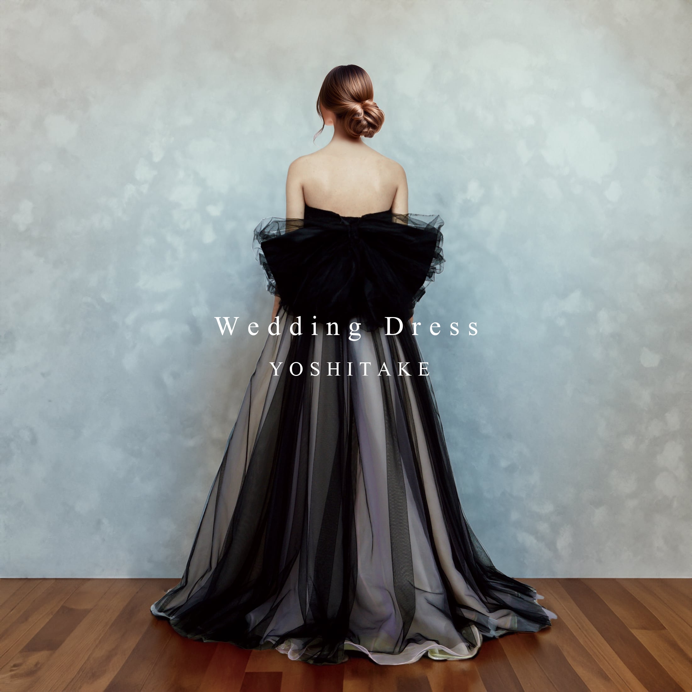 柔らかいブラックチュールが重なる大人カワイイ一着。レース生地のビスチェが上半身を上品に引き締め、後ろにはふんわりと存在感のあるビッグリボン。動くたびに違う表情を見せるドラマティックなドレスです。
