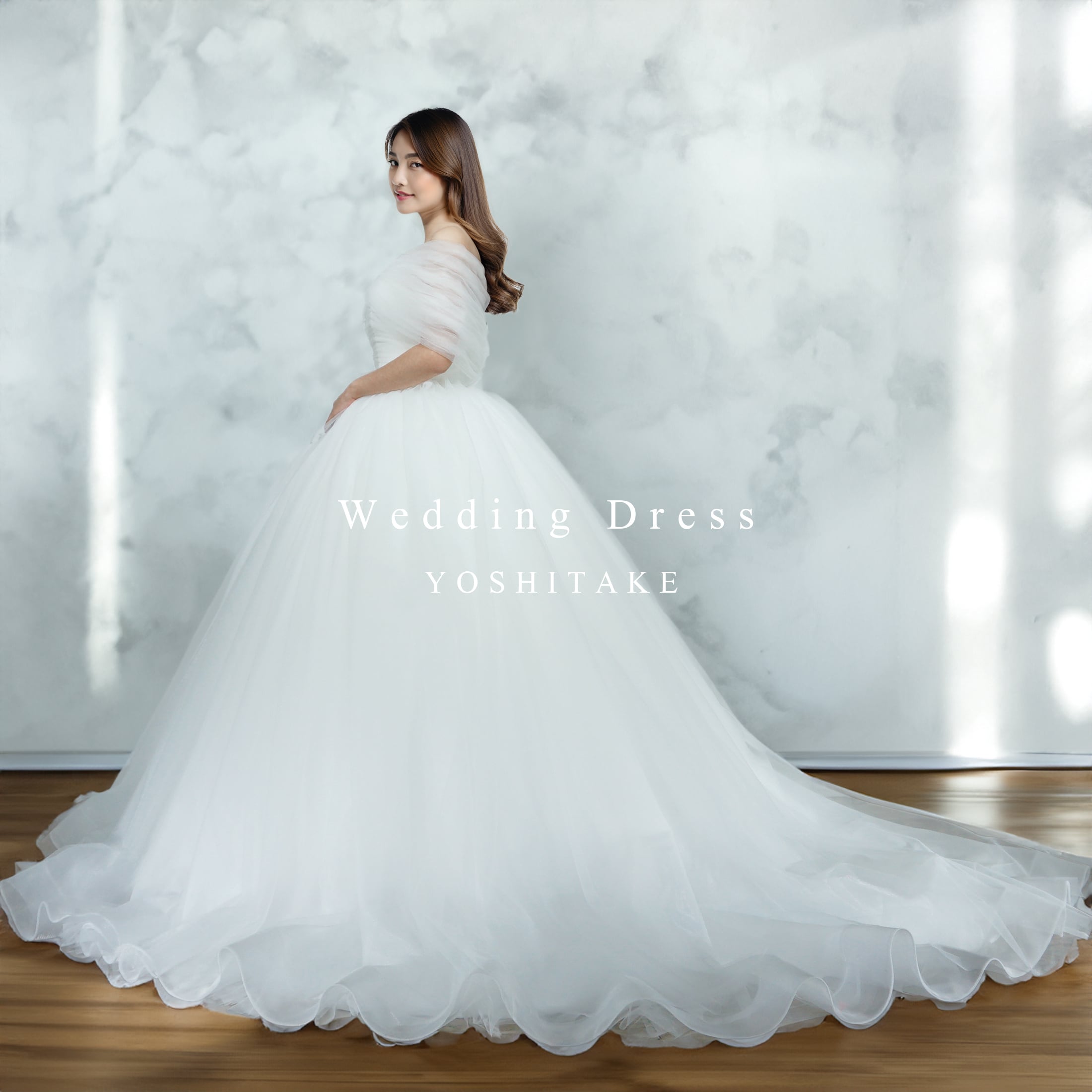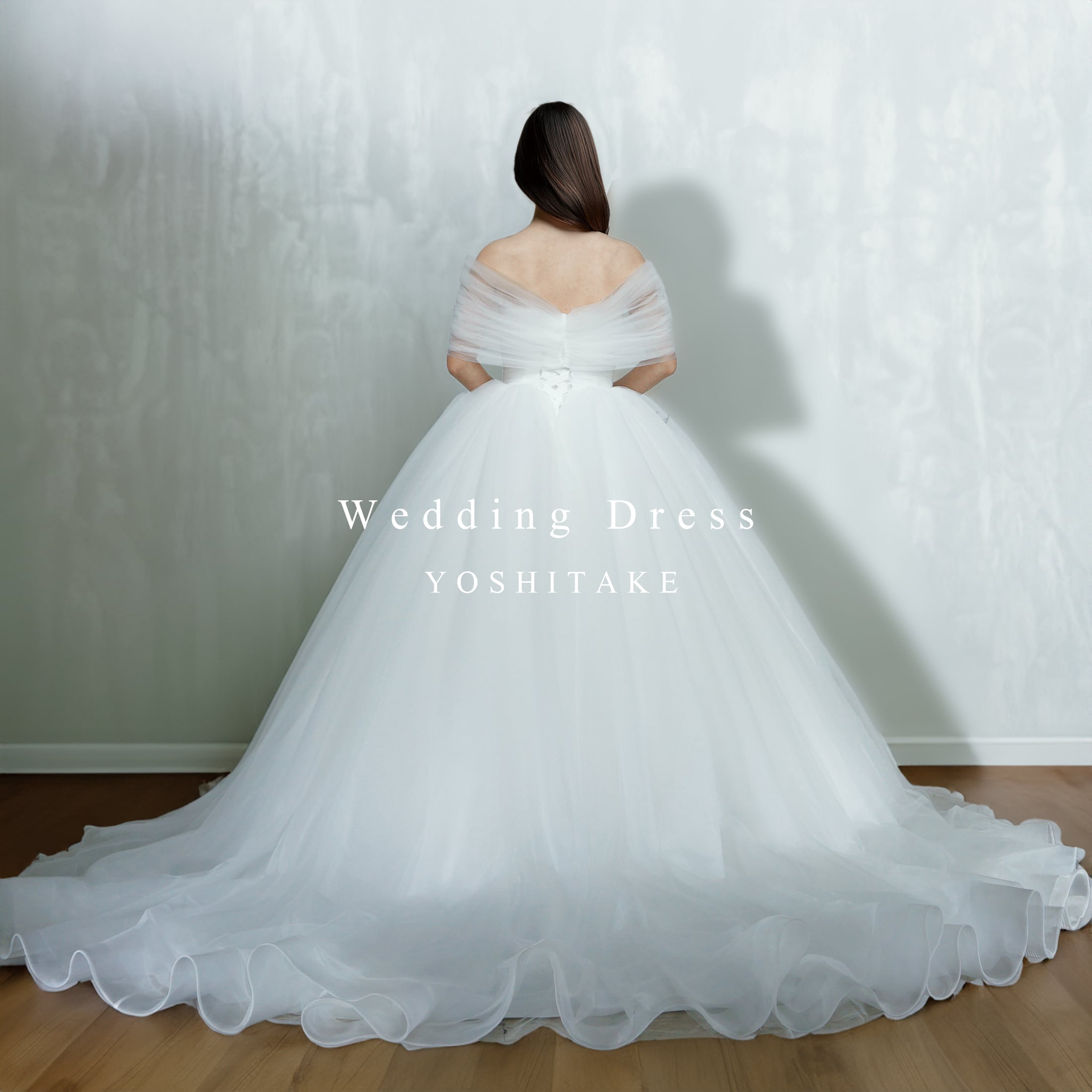 ふんわり広がるプリンセスラインに、軽やかなオーガンジーをたっぷり重ねた華やかな一着。リボンをきゅっと結んだようなオフショルダーパーツがついていて、上品さと可愛らしさをほどよくプラスしてくれます。