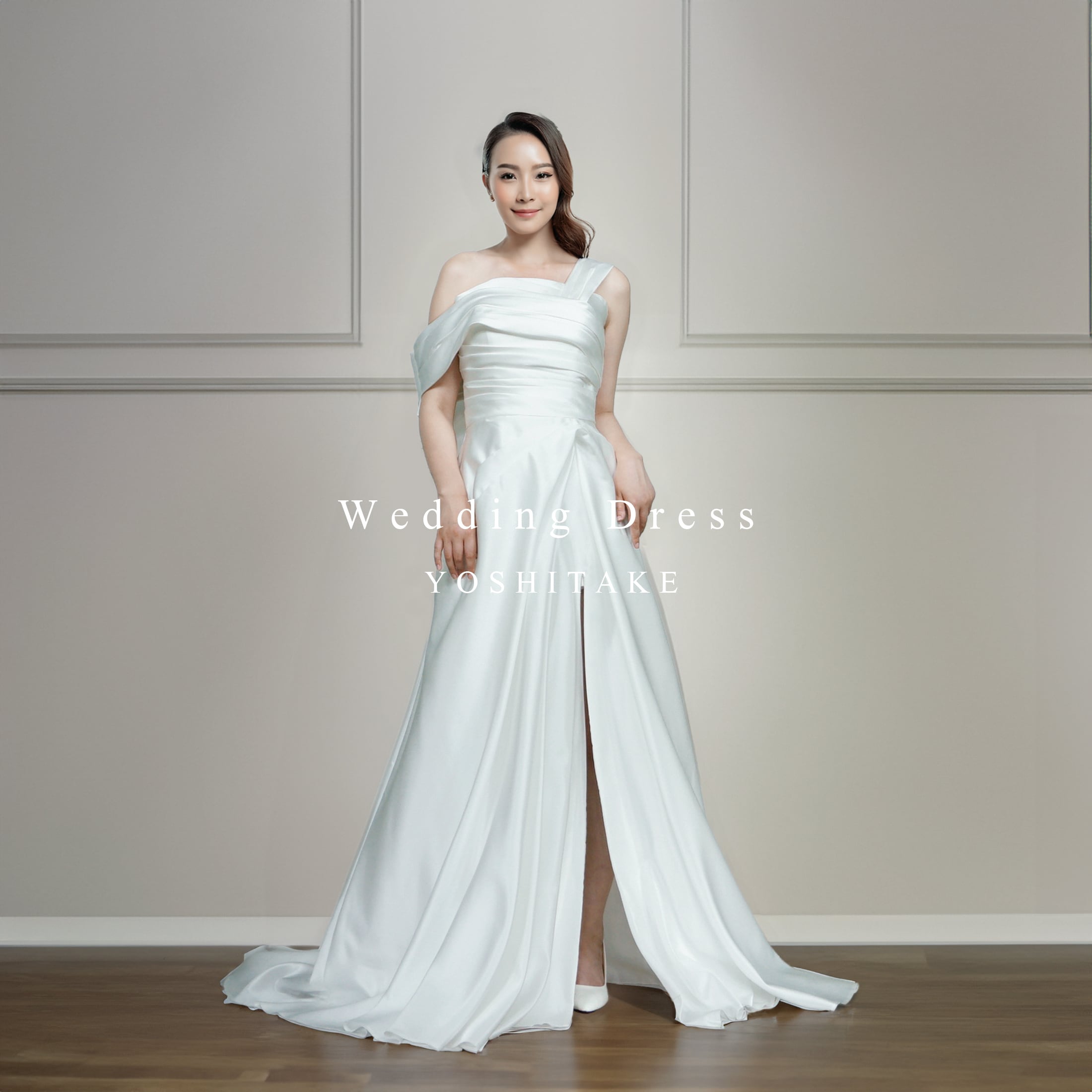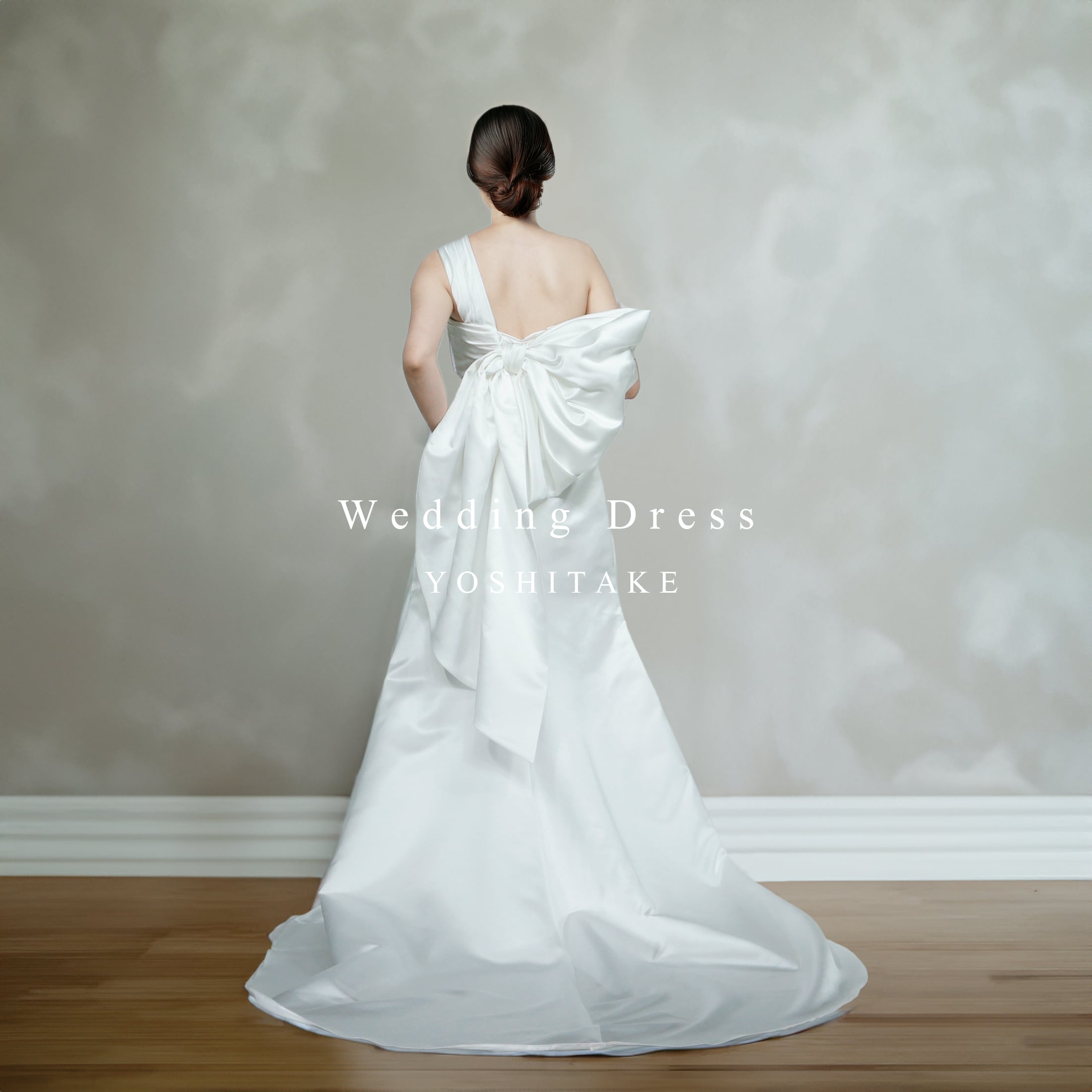 ワンショルダーのデザインが目を引く、シンプルで今っぽいウエディングドレス。やわらかなドレープと、歩くたびにちらっと見えるスリットが軽やかな印象に。バックスには大きなリボンをあしらって、後ろ姿も華やか。