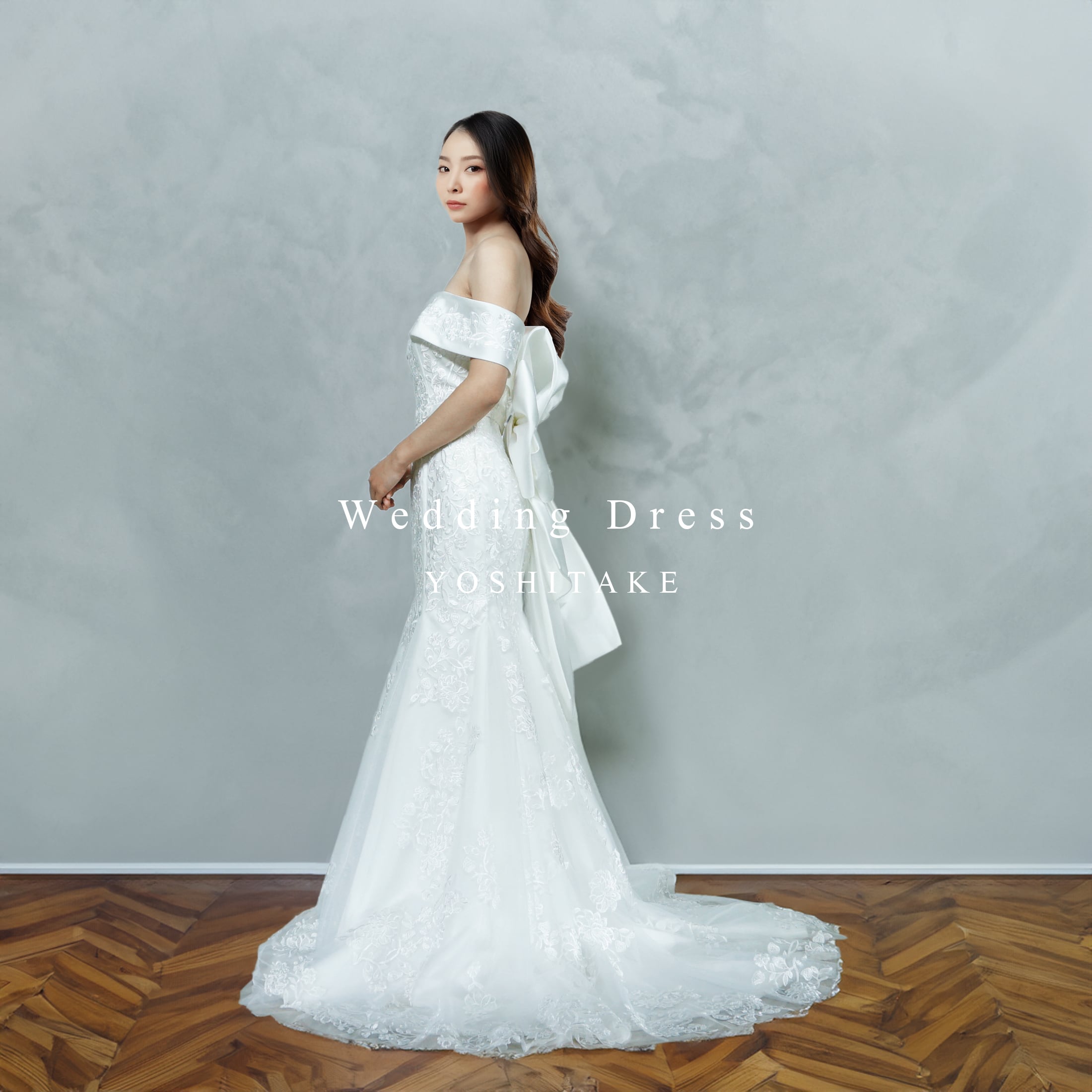 繊細なレースをまとったマーメイドラインに、肩をすっきり見せてくれるオフショルダー。大人っぽいやわらかく自然な雰囲気が魅力。バックスタイルはビッグリボンとトレーンでシンプルな中にも華やかさのある一着。