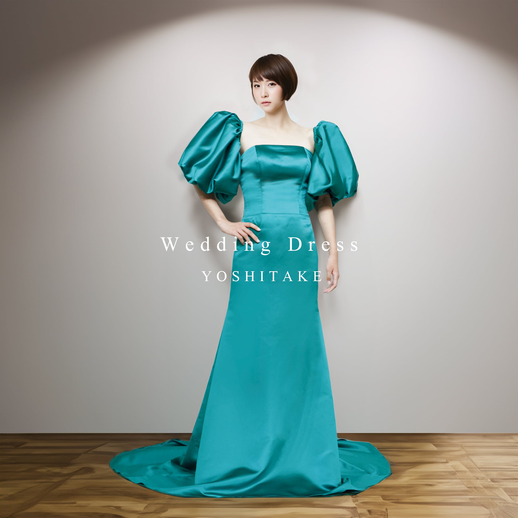 きちんと感の中に遊び心を。深みのあるグリーンが目を引く、大人っぽいウェディングドレス。すっきりとしたネックラインに、ふんわり立体的なパフスリーブを合わせて、シンプルだけど印象に残るデザインに仕上げました。