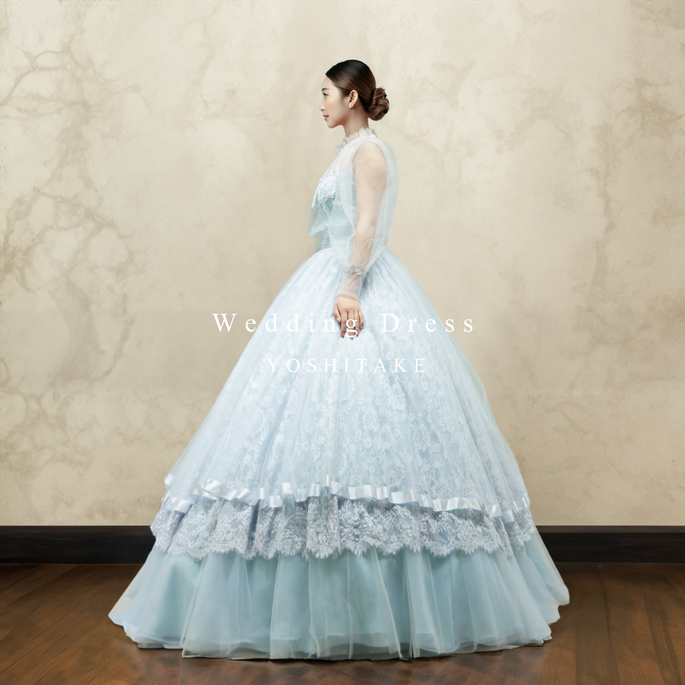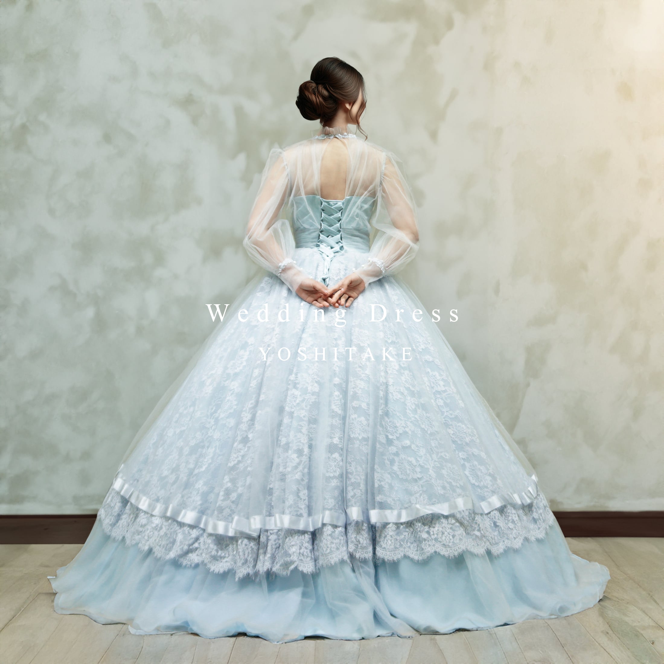 透明感のある淡いブルーカラーに、繊細なレースをたっぷり重ねたウエディングドレス。カワイイをぎゅっと詰め込んだ、こころときめく一着。デコルテと袖は程よい透け感で軽やかに、可憐さと上品さをプラスしました。