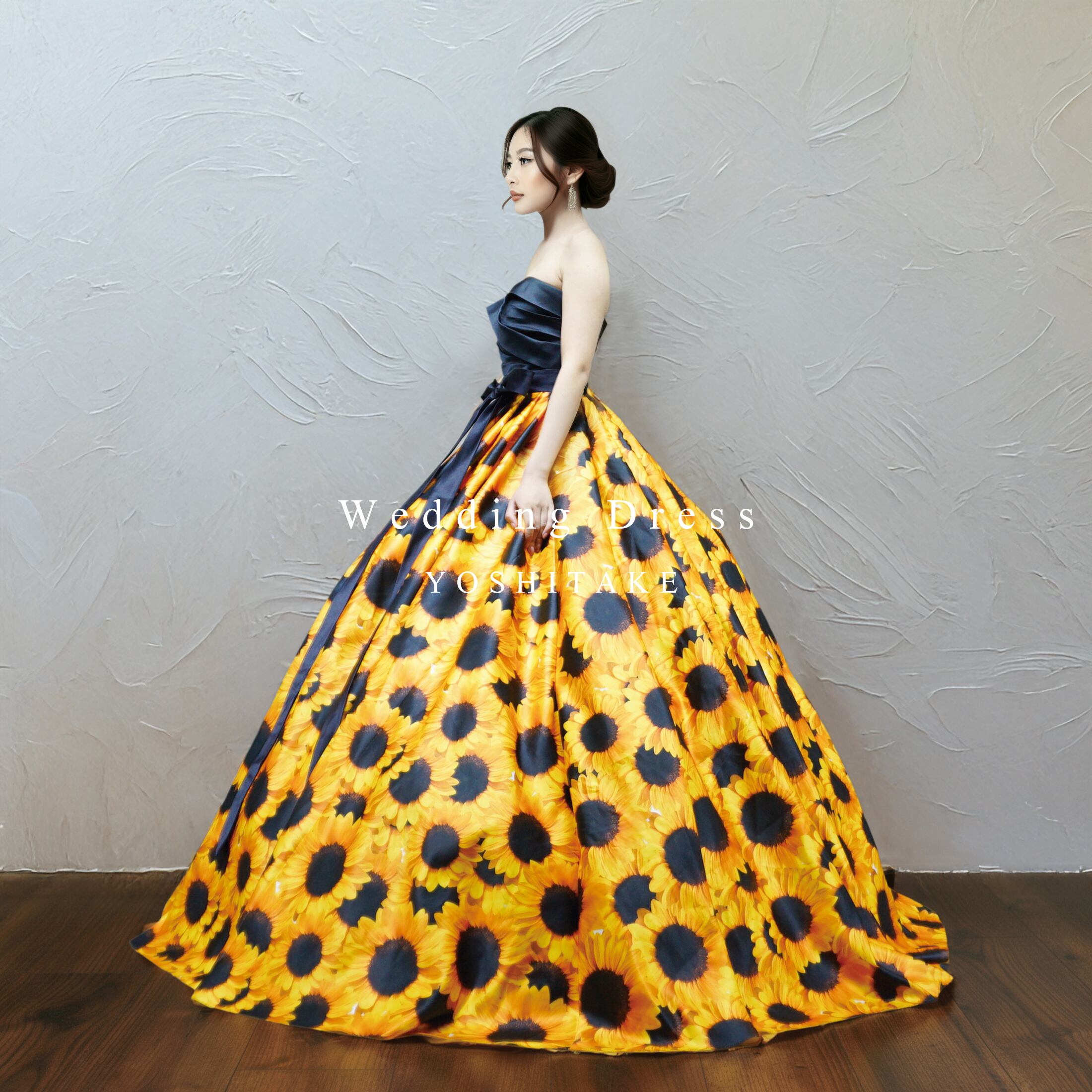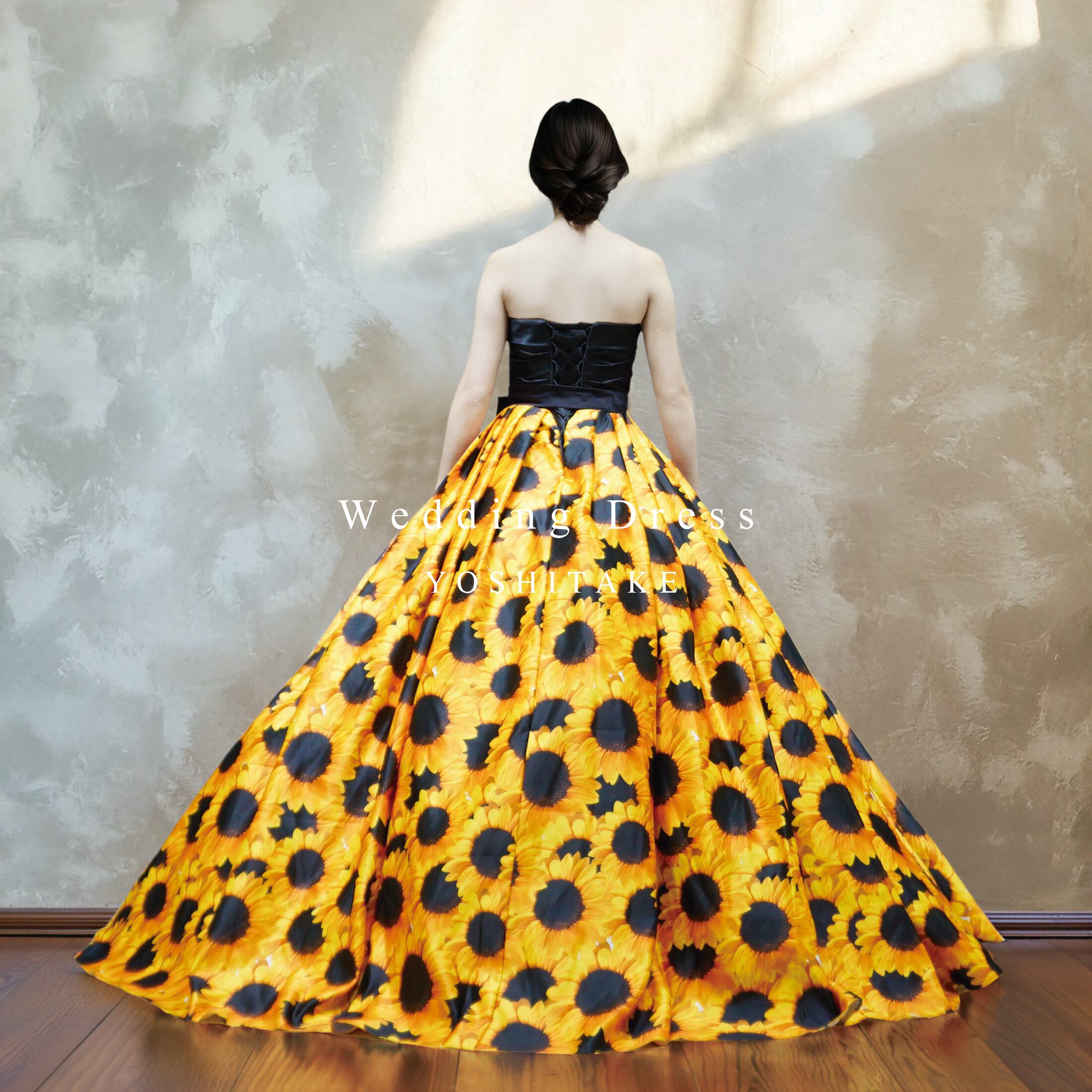 スカートいっぱいに咲き誇る大胆なヒマワリ柄が、歩くたびにドラマティックに揺れ動きます。誰よりも華やかに、一瞬で視線をさらう主役級のウエディングドレス。ガーデンウエディングにもおススメのデザインです。