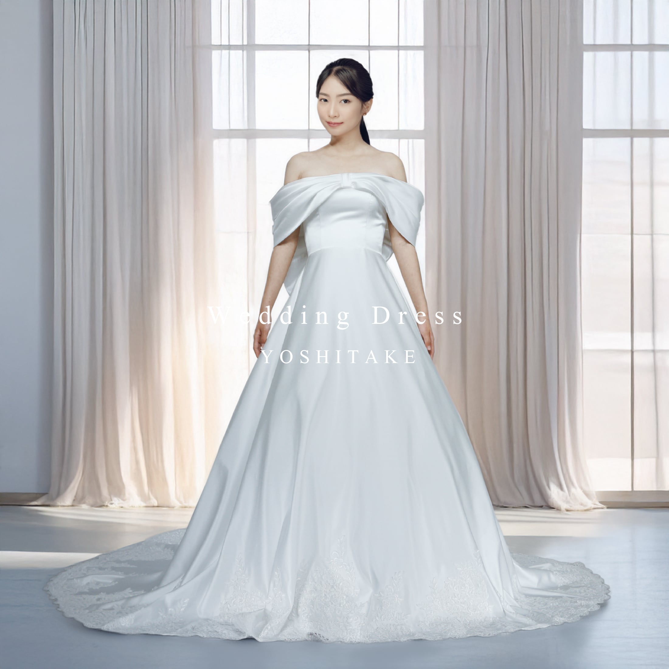 【アウトレット】ウエディングドレス(無料パニエ) ウエディングドレス.白.オフショルダー.リボン.Aライン.レース.Y2768