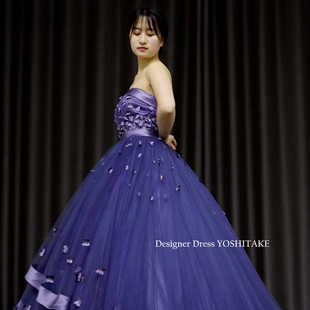他の人は絶対にかぶらない、弊社オリジナルドレスで、花もハンドメイドで作りました。花の真ん中にはパールをいれてます。青みが強いパープル系カラーのサテンとチュールを使用。披露宴、お色直し、演奏会にいかがですか。