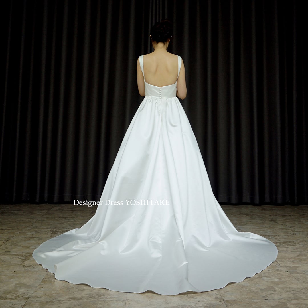 フロントはポートネックのノースリーブでバックは背中が大きく開いたラインとなっています。背中の仕様はジッパー。スカートは、Aラインのパニエ付きです。シンプルながら落ち着きのあるエレガントな1着です。