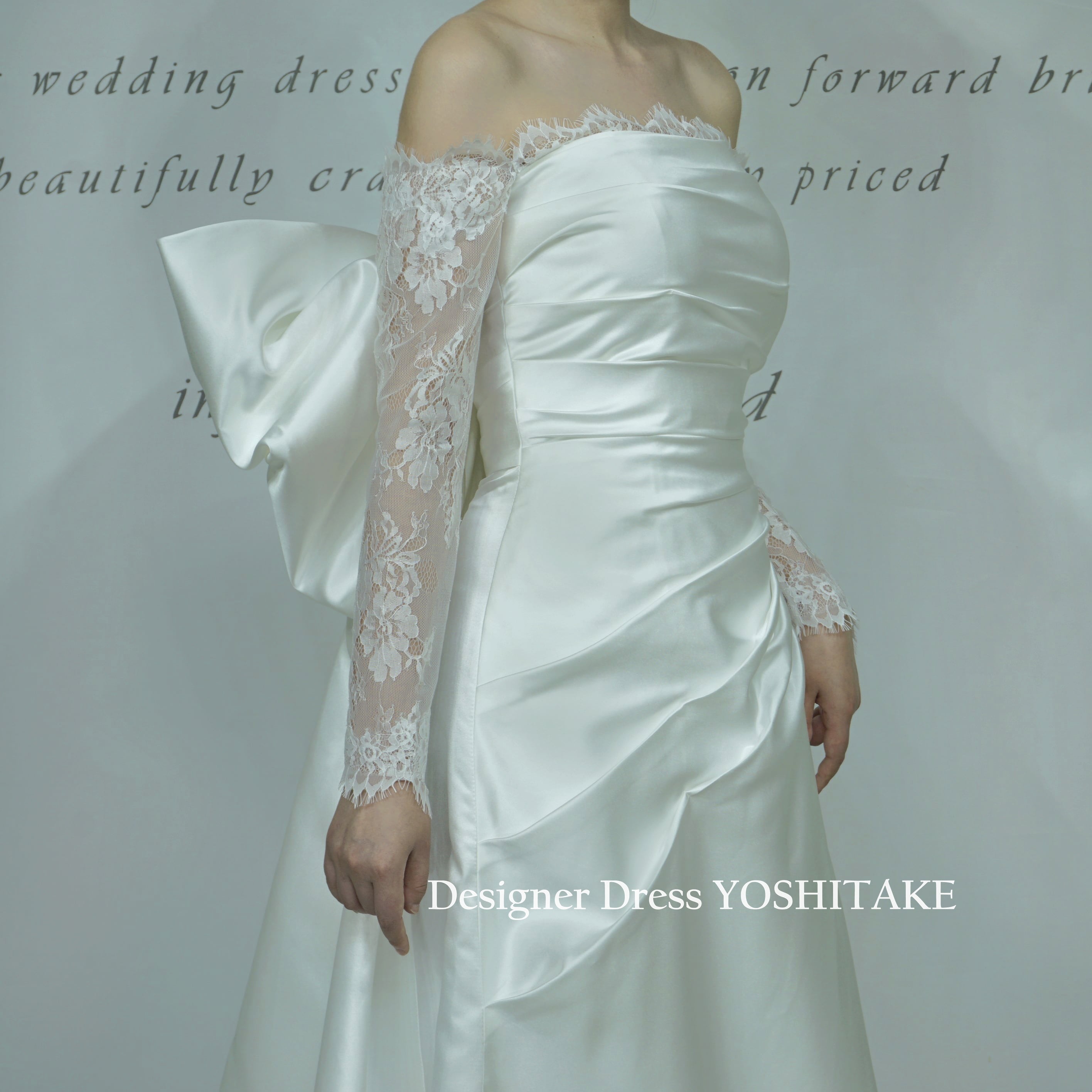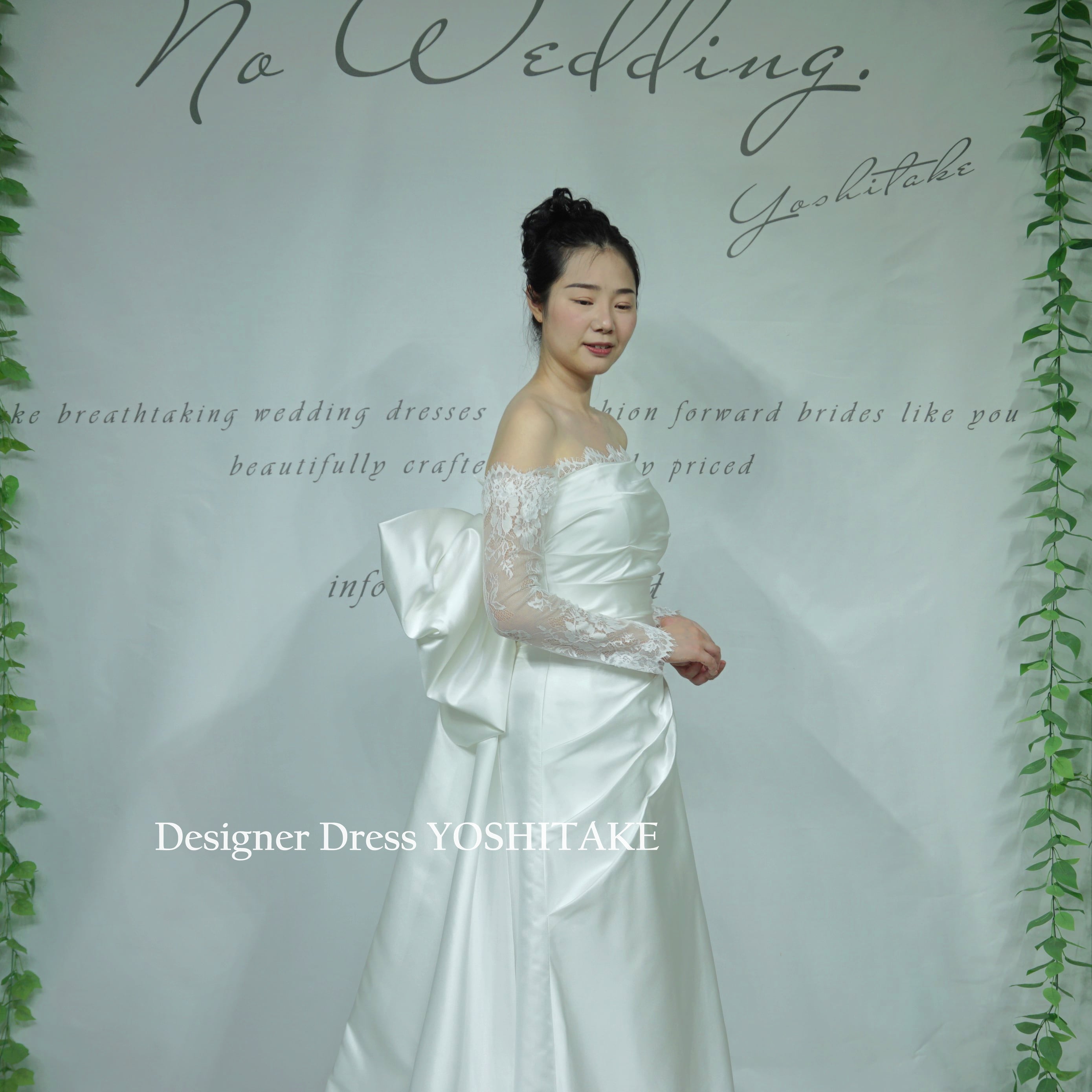 オフショルダーの長袖レース付きのマーメイドドレスです。二の腕が気になる方に人気です。背中には大き目のサテンリボントレーンをつけました。オーダーの場合は、リボンのデザインを違うデザインに変更も可能です。