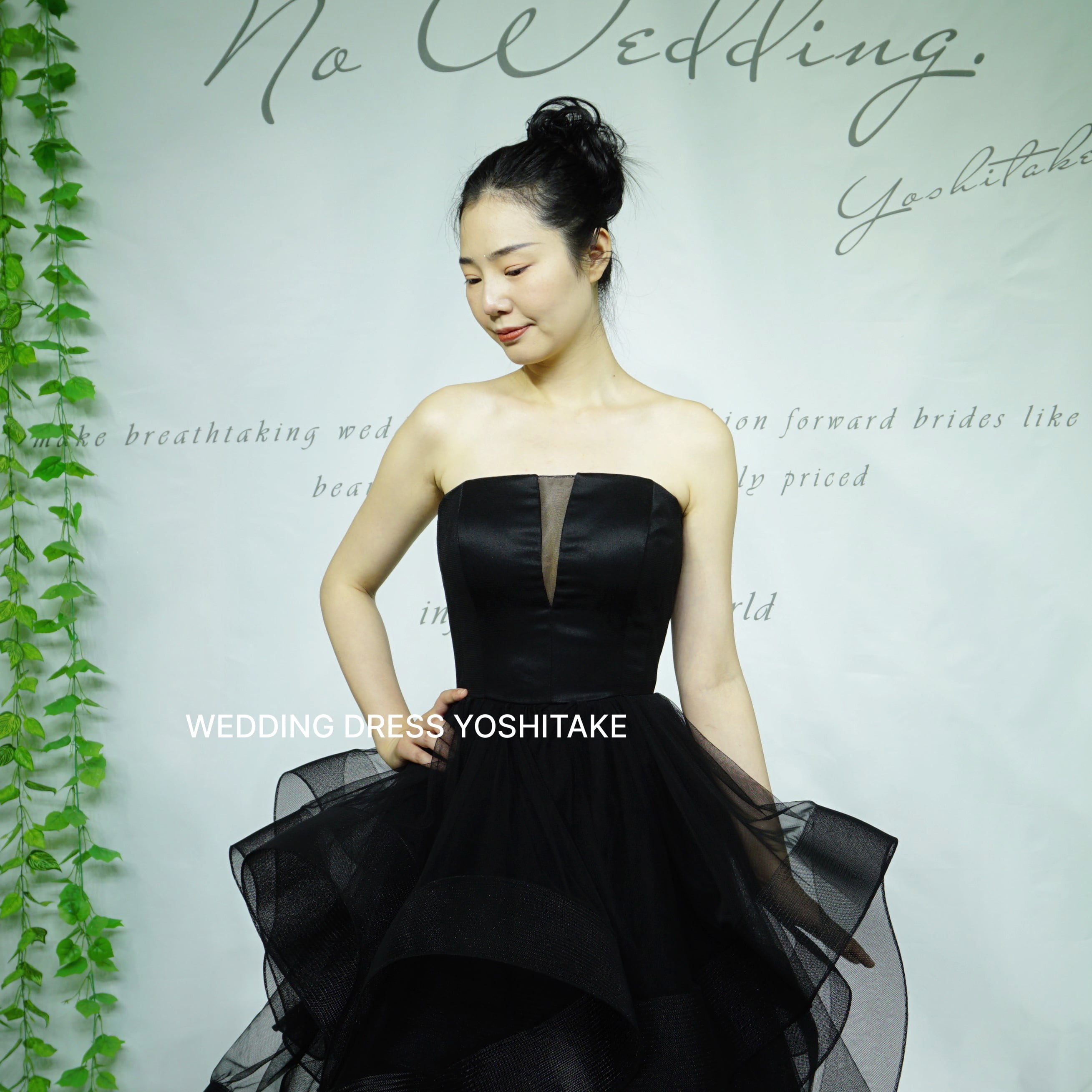 黒を基調としたスタイリッシュなデザインで伝統的なウェディングスタイルから一線を画します。胸元のスリットにチュールをかぶせ上半身のデザインにアクセントを。レイヤー状に重なるスカートのフリルも特徴的です。
