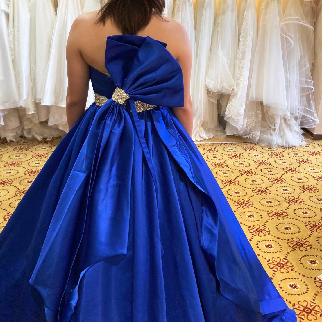 こちらは以前オーダーされたお客様のドレスです。代理にて出品させいてただきます。 鮮やかなロイヤルブルーの色合いがとても目を引く一着。 華やかでありながらも上品な印象を与えます。背中の大きなリボンデザインが印象的です。 ウエストのレース装飾はゴージャスなアクセントになっています。