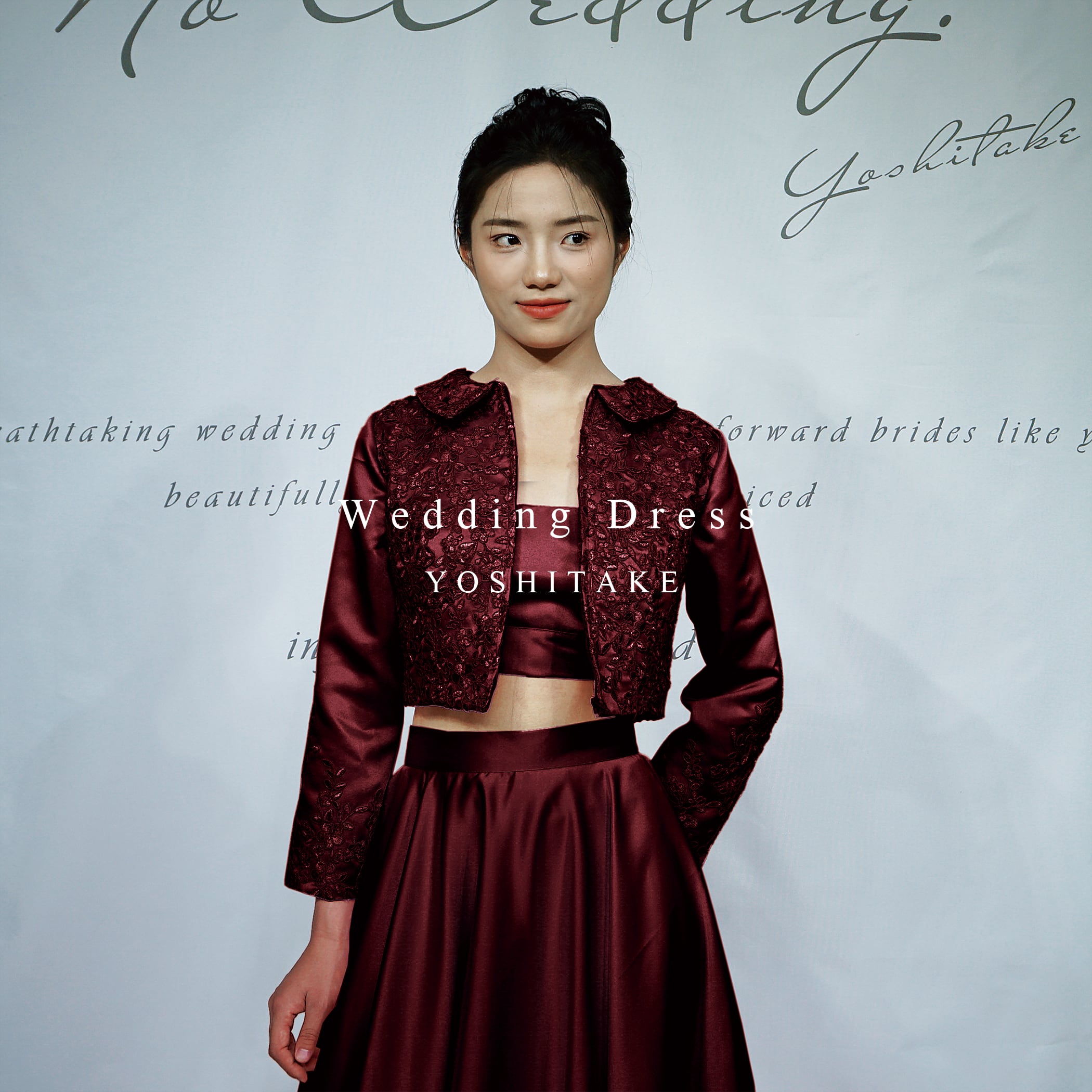 深みのあるボルドーカラーが印象的なセパレートドレス。繊細な刺繍を施したジャケットと、サテンスカートが奏でる優雅で洗練されたシルエット。ウエディングはもちろん、パーティドレスとしてもご着用頂けます。